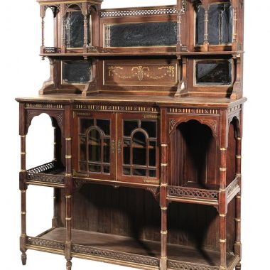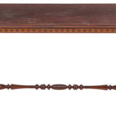 256 – Mesa baja victoriana en madera de caoba y marquetería con tablero rectangular. Apoya en dos patas salomónicas unidas por travesaño. Inglaterra, S. XIX