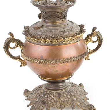 254 – Quinqué del S. XIX adpatado a lámpara con cuerpo en cobre y monturas en bronce