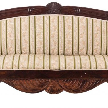 262 – Sofá fernandino en madera de caoba con brazos, faldón y patas con talla de festón y copete en forma de venera. Primera mitad S. XIX