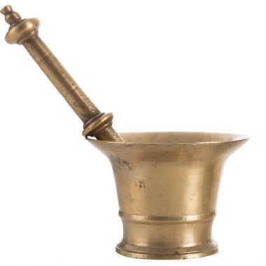 247 – Mortero en bronce dorado con maja, decorado con fina moldura que rodea la pieza en forma de anillo. S. XIX